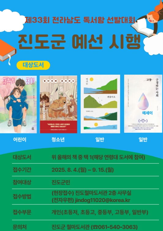 독서왕 선발대회에 참가하는 방법은 2025년 전라남도 ‘올해의 책’으로 선정된 해당 연령대의 도서를 읽고, 독후감을 작성해 9월 15일 18시까지 진도 철마도서관에 신청하면 된다.