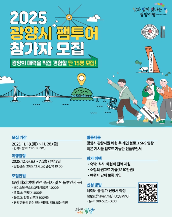 [파이낸셜경제=김예빈 기자] 광양시가 낮과 밤이 빛나는 광양의 매력적인 관광자원을 직접 체험하고, 감각적인 콘텐츠로 널리 홍보할 영향력 있는 ‘2025 G-관광 팸투어’ 참가자를 모집한다.