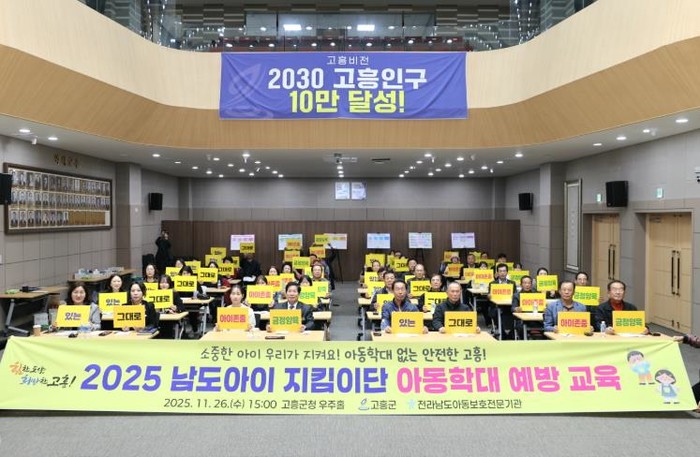 [파이낸셜경제=김예빈 기자] 고흥군은 지난 26일 고흥군청 우주홀에서 이장과 아동업무 담당자를 대상으로 ‘2025년 남도아이 지킴이단 아동학대 예방교육’을 실시했다고 밝혔다.