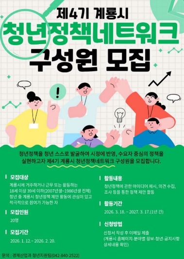 [파이낸셜경제=김영란 기자] 충남 계룡시는 이달 12일부터 오는 2월 20일까지 제4기 청년정책네트워크에 참여할 지역 청년을 모집한다.