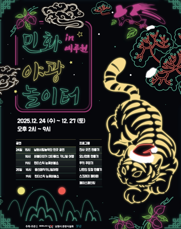 또한 행사장 내에서는 블랙라이트가 적용된 민화 체험 놀이터, 형광 소품을 직접 제작하는 DIY 체험 프로그램(스테인드글라스 트리 오너먼트 만들기, 전사 프린트 굿즈 제작, 크리스마스 쿠키 만들기, 나만의 굿즈 도장 만들기, UV 스크래치 페이퍼 및 UV 페이스페인팅 체험 등)과 더불어 남원시립농악단 공연, 버블·매직·벌룬쇼 등 크리스마스 분위기를 담은 다양한 공연프로그램도 함께 운영된다.
