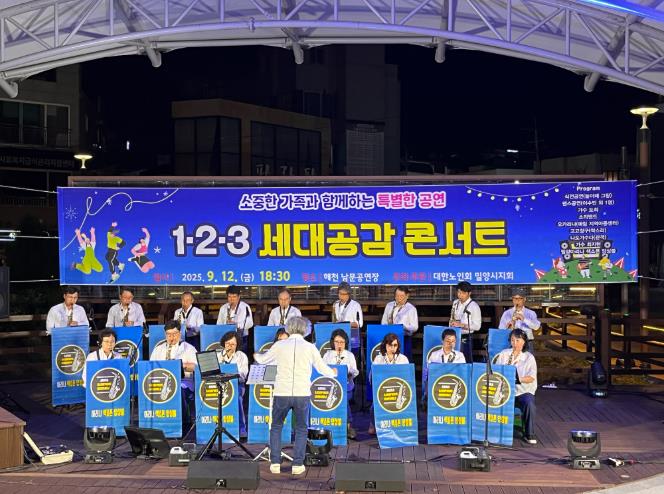 [파이낸셜경제=김예빈 기자] 대한노인회 밀양시지회는 내일동 해천공연장에서 지역주민 등 150여 명이 참여한 가운데‘1.2.3 세대공감 콘서트’를 성황리에 개최했다고 15일 밝혔다.
