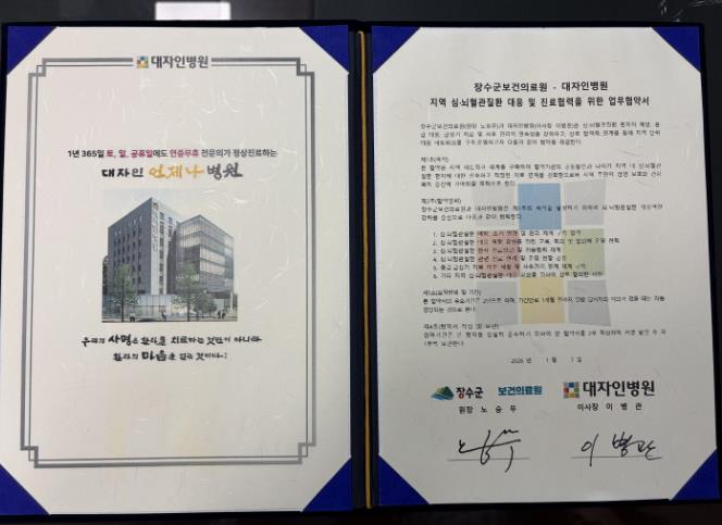 [파이낸셜경제=김예빈 기자] 장수군은 대자인병원과 심뇌혈관질환 발생 시 신속하고 효과적인 대응을 위해 상호 진료협력 체계를 구축하는 ‘심뇌혈관질환 대응 진료협력 협약(MOU)’을 체결했다고 9일 밝혔다.
