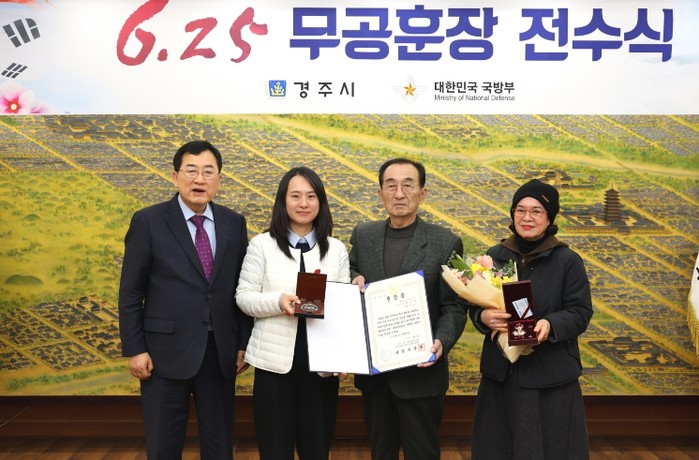 [파이낸셜경제=김지훈 기자] 경주시는 지난 12일, 6·25전쟁 당시 무공을 세운 유공자 故 주석종 상사의 유족에게 무공훈장과 훈장증, 기념패를 전수했다.