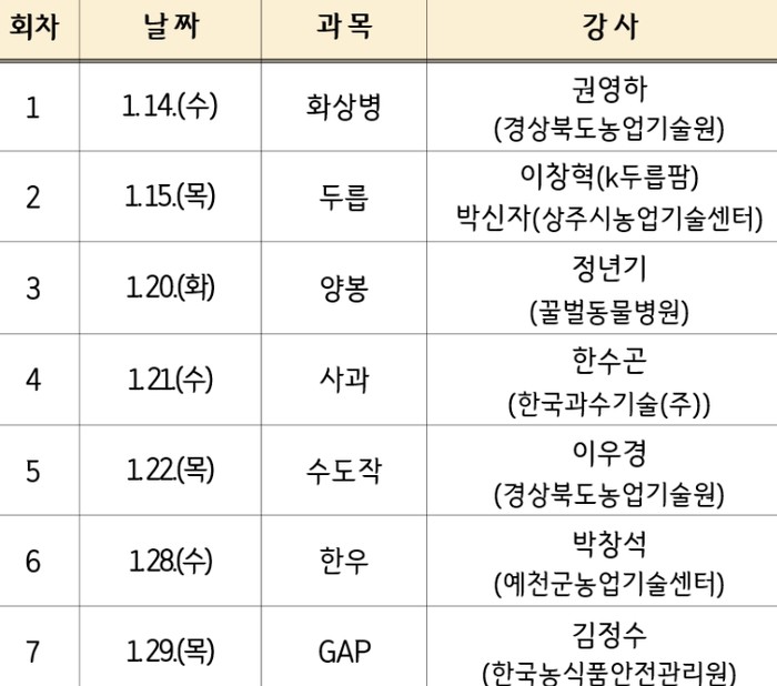 일정과 과목은 14일 화상병 과정을 시작으로, 15일 두릅, 20일 양봉, 21일 사과, 22일 수도작, 28일 한우, 29일 GAP과정까지 총 7개 과정으로 이뤄진다.