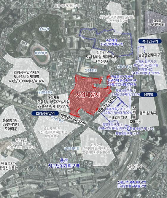 대상지는 1호선 남영역, 6호선 및 경의·중앙선 효창공원앞역 더블 역세권에 위치하고 있으며, 주변 간선도로변에는 경의선 숲길 근린공원,문배업무지구 및 상업시설이 입지하여 다채로운 도시공간을 형성하고 있는 지역이다.
