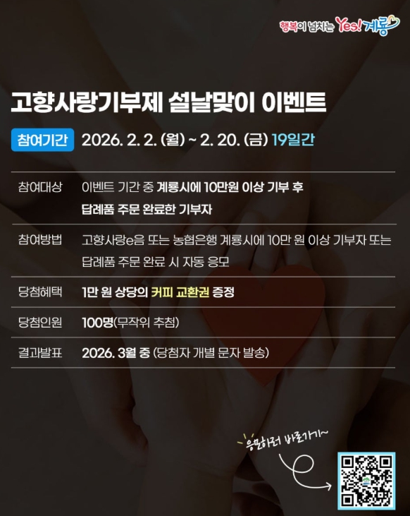 이번 이벤트는 설 명절을 맞아 고향을 생각하는 마음으로 계룡시에 기부하는 시민들의 참여를 독려하고, 고향사랑기부제에 대한 관심과 참여를 높이기 위해 마련됐다.