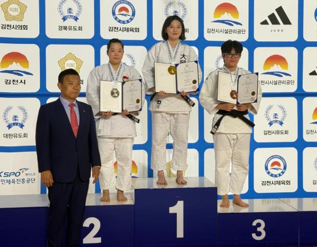 | ▲ 지난 10일 순천시청 김지정 선수가 김천에서 열린 '2025 김천컵 전국유도대회'에서 개인전 동메달을 수상하고, 기념사진을 촬영하고 있다(맨 우측 김지정 선수) |