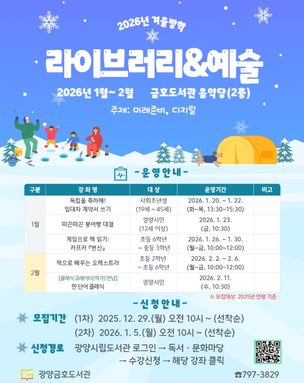 프로그램 신청은 강좌별 모집 일정에 따라 12월 29일 오전 10시부터 선착순으로 진행되며, 자세한 사항은 광양시립도서관 누리집을 확인하거나 금호도서관으로 문의하면 안내받을 수 있다.