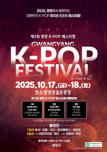 이현주 관광과장은 “제5회 광양 K-POP 페스티벌은 국내 최정상 아이돌그룹에서부터 발라드, 댄스, 트롯 등 강렬한 퍼포먼스와 뛰어난 가창력을 선보일 최강의 라인업을 확정했다”며 “시민이 일상에서 즐기고 관광객이 찾는 명실상부 글로벌 관광축제로 발돋움한 광양 K-POP 페스티벌을 빈틈없이 준비해 격조 있고 수준 높은 관광수용태세로 관람객을 맞겠다”고 말했다.
