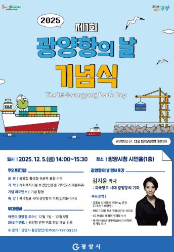 [파이낸셜경제=김예빈 기자] 광양시는 오는 12월 5일 오후 2시 시청 시민홀에서 ‘제1회 광양항의 날’ 기념식을 열고 명사 특강을 진행한다고 밝혔다.