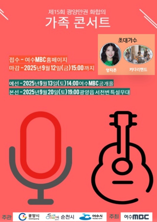[파이낸셜경제=김예빈 기자] 광양시는 오는 9월 20일 오후 7시, 광양읍 서천변 특설무대에서 ‘제15회 광양만권 화합의 가족콘서트’가 열린다고 밝혔다.