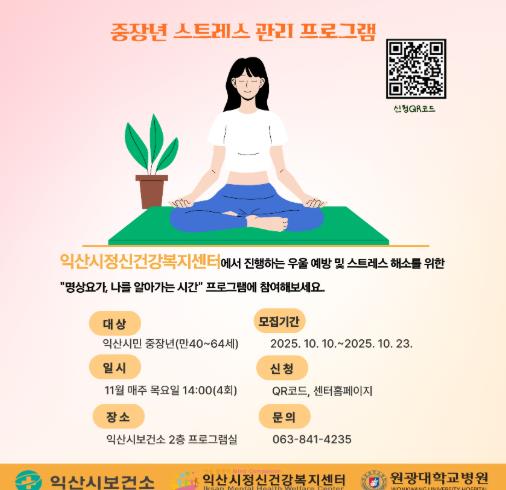[파이낸셜경제=김예빈 기자] 익산시정신건강복지센터는 만 40~64세 중장년을 대상으로 '마음힐링 명상요가' 프로그램을 운영한다고 10일 밝혔다.