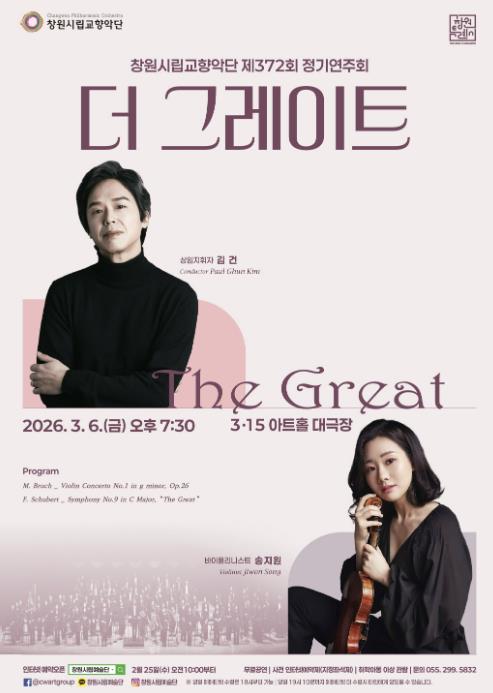 [파이낸셜경제=김예빈 기자] 창원시립교향악단은 오는 2026년 3월 6일 오후 7시 30분, 창원 3.15아트홀 대극장에서 제372회 정기연주회 '더 그레이트(The Great)'를 개최한다.