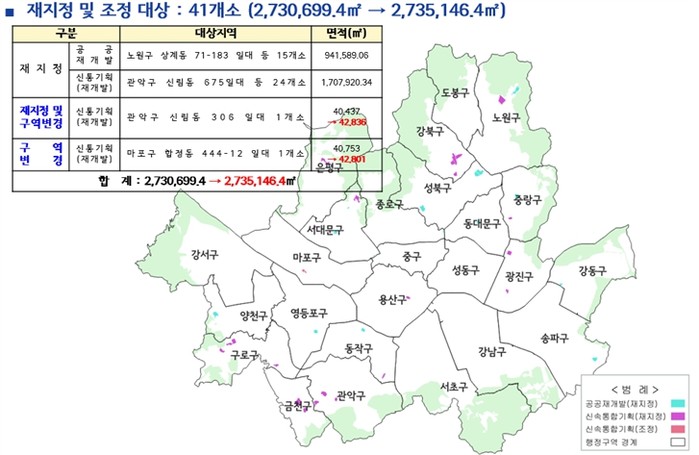 또한, 지정기간이 만료될 예정인 기존 공공재개발 15곳, 신속통합 재개발 25곳 등 총 40곳에 대해서는 투기수요 유입 방지를 위해 2027년 4월 3일까지 재지정했다. 이 중 신속통합기획 주택재개발 구역인 관악구 신림동 306 일대는 구역계가 변경됨에 따라 편입된 토지를 포함하여 토지거래허가구역을 조정(40,437㎡ → 42,836㎡)했다.