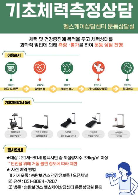 두 가지 측정 프로그램 모두 송탄보건소 1층 헬스케어상담센터에서 진행되며, 예약은 카카오톡 채널 ‘송탄보건소 건강정보톡!’또는 전화로 가능하다.