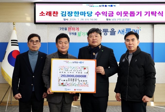[파이낸셜경제=김기보 기자] 인천시 남동구는 최근 (사)인천식품제조연합 남동구협회로부터 ‘2025년 남동구 소래찬 김장한마당’ 판매 수익금 총 2천만 원을 기탁받았다고 30일 밝혔다.