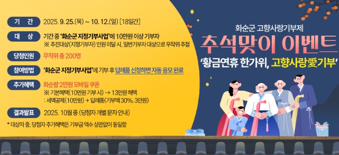 [파이낸셜경제=김예빈 기자] 화순군은 민족 대명절 추석을 맞아 고향사랑기부제 감사 이벤트인 ‘황금연휴 한가위, 고향사랑愛기부’를 오는 9월 25일부터 10월 12일까지(18일간) 진행한다고 밝혔다.
