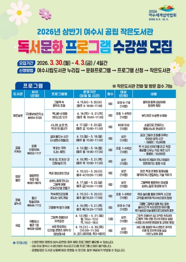 | ▲ 2026년 상반기 여수시 공립 작은도서관 ‘독서문화 프로그램 수강생 모집’ 안내 포스터 |