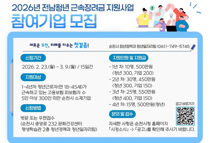 [파이낸셜경제=김예빈 기자] 순천시는 지역 청년들의 정규직 취업 촉진 및 장기근속을 유도하기 위해 2026년 전남 청년 근속장려금 지원사업 참여 기업을 모집한다고 밝혔다.