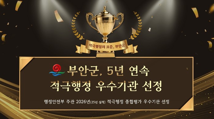 [파이낸셜경제=김예빈 기자] 부안군은 행정안전부에서 주관한 2026년(2025년 실적) 지방정부 적극행정 종합평가에서 우수기관으로 선정돼 지난 2021년 하반기 성과 점검부터 5년 연속 우수기관 선정이라는 금자탑을 쌓았다고 밝혔다.