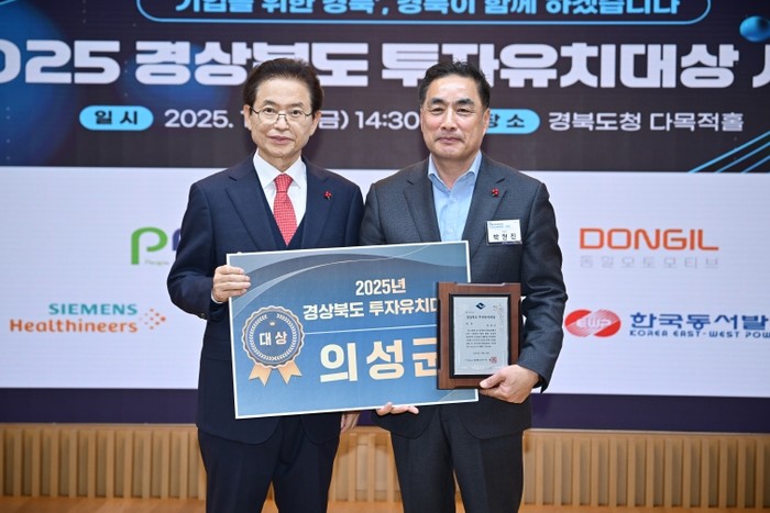 [파이낸셜경제=김지훈 기자] 의성군은 지난 19일 경북도청에서 열린 ‘2025년 경상북도 투자유치대상’ 시상식에서 투자유치 활성화 성과를 인정받아 3년 연속 대상을 수상했다고 밝혔다.