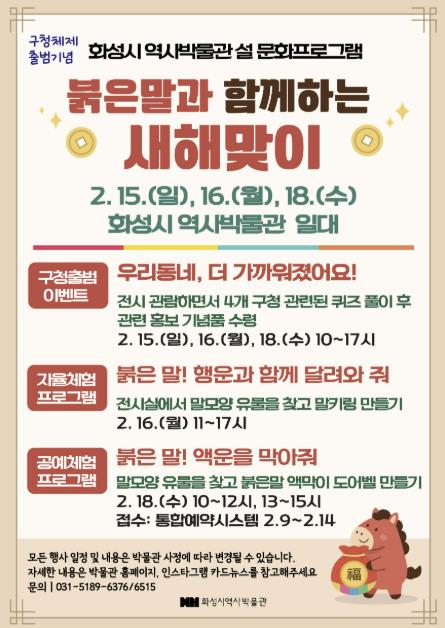정상훈 문화유산과장은 “병오년을 맞아 가족, 친구, 연인들이 함께 즐기며 화합할 수 있는 다채로운 체험을 마련했다”며, “화성시 역사박물관에서 따뜻한 설 명절을 보내시길 바란다”고 전했다.