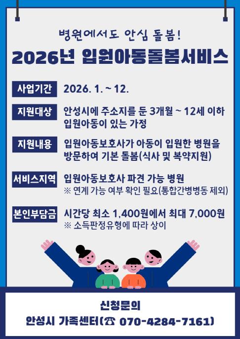 2026년 운영되는 입원아동돌봄서비스는 전년도와 동일하게 아동이 입원한 병원의 위치와 관계없이 안성시에 주소지를 둔 아동(3개월~12세 이하)을 대상으로 지원하며, 이용요금은 시간당 최소 1,400원에서 최대 7,000원으로 소득 판정 유형에 따라 차등 지원한다.