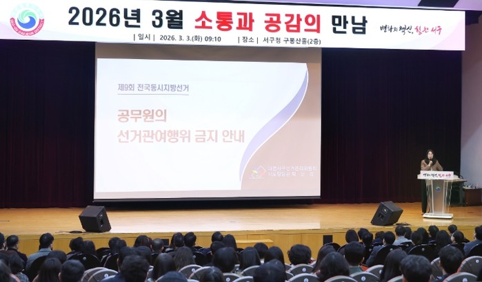 [파이낸셜경제=김영란 기자] 대전 서구는 3일 구청 구봉산홀에서 직원 월례 소통 행사와 연계해 ‘공무원 정치적 중립 및 선거 관여 금지 교육’을 진행했다.