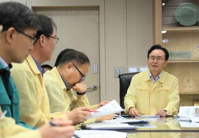 | ▲ 윤병태 시장(왼쪽)이 집중호우 피해 복구 계획 수립을 위해 대책 회의를 진행하고 있다.(사진 제공-나주시) |