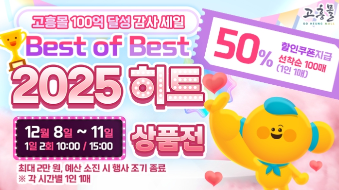 [파이낸셜경제=김예빈 기자] 고흥군은 직영 온라인 농수축특산물 쇼핑몰 ‘고흥몰’이 누적 매출 100억 원 돌파를 기념해 오는 1월 8일부터 11일까지 ‘100억 달성 감사 세일–2025 Best of Best’ 기획전을 진행한다고 밝혔다.