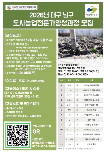 [파이낸셜경제=김지훈 기자] 대구 남구는 도시농업에 대한 전문적인 지식을 전달하고 현장 실무 역량을 갖춘 인력을 양성하기 위해 ‘2026년 도시농업전문가 양성과정’ 수강생을 모집한다고 밝혔다. 이번 과정은 도심 속 농업의 가치를 확산시키고 구민들에게 새로운 직업 역량 강화 및 사회 참여의 기회를 제공하기 위해 기획됐다.