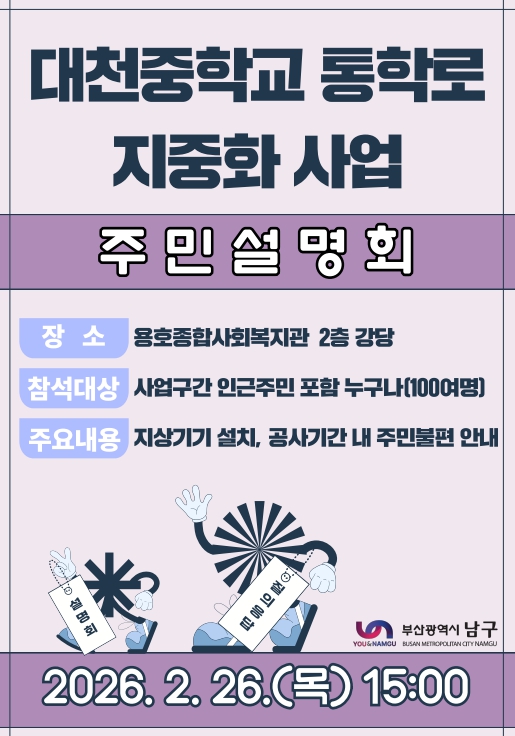 [파이낸셜경제=박영진 기자] 부산 남구는 '대천중학교 통학로 지중화사업'과 관련해 오는 2월 26일 오후 3시, 용호종합사회복지관 2층 강당에서 1차 주민설명회를 개최한다.