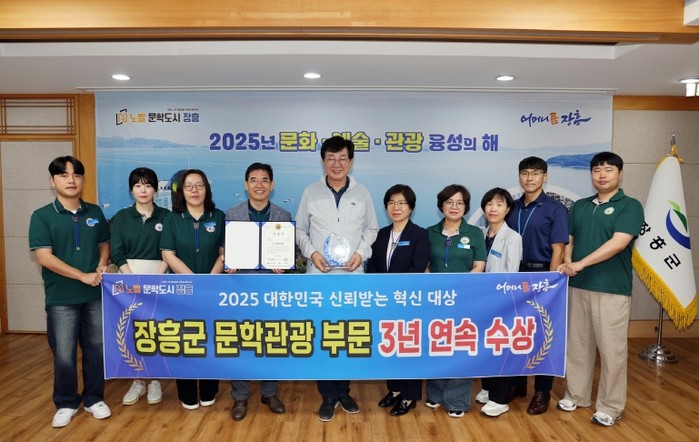 [파이낸셜경제=김예빈 기자] 장흥군이 9월 29일 개최한 ‘2025 대한민국 신뢰받는 혁신대상’시상식에서 문학관광 부문 공공혁신 대상을 수상했다고 밝혔다.