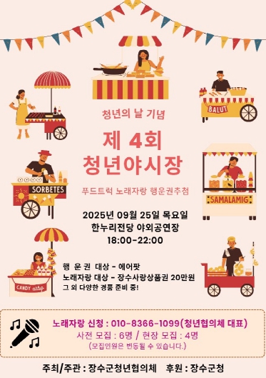 이어 청년 노래자랑이 진행돼 참가자들이 끼와 열정을 뽐내고, 우수 참가자에게는 장수사랑상품권과 푸짐한 상품이 수여된다.