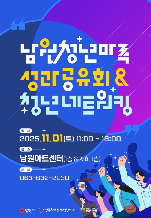 [파이낸셜경제=김예빈 기자] 남원시는 청년활동 거점공간인 ‘청년마루’의 한 해 성과를 시민과 함께 공유하고, 지역 청년들이 서로 소통하며 새로운 가능성을 모색하는 '2025 남원 청년마루 성과공유회 · 청년네트워킹 데이'를 11월 1일남원 아트센터에서 개최한다.