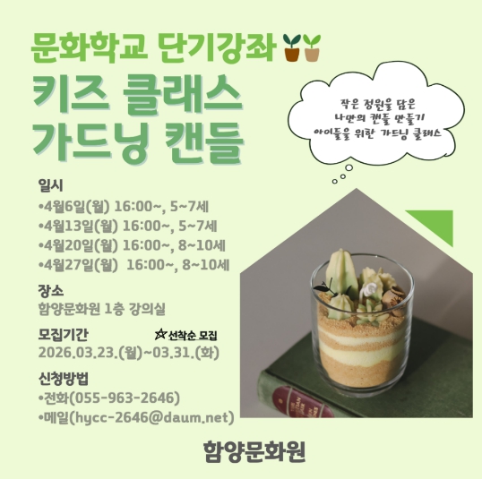 [파이낸셜경제=김예빈 기자] 함양문화원(원장 정상기)은 군민들에게 문화예술 체험 기회를 제공하기 위해 오는 4월 단기강좌 '글라스아트 클래스'와 '키즈 캔들 클래스'를 운영한다.