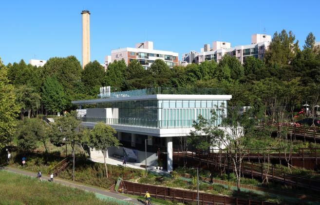 수변문화쉼터는 2023년 2월 서울시 ‘수변활력거점 조성사업’ 공모에 선정된 뒤 약 2년여 준비 끝에 문을 열었다. 2023년 6월부터 2024년 5월까지 설계용역을 진행했고, 2024년 8월 착공해 지난 9월 12일 공사를 마쳤다. 시설 부지 626.75㎡(약 190평), 지하 1층~지상 1층 규모로, 산책·휴식·독서·공연·전시·체험이 가능한 생활밀착형 복합문화공간으로 조성됐다.