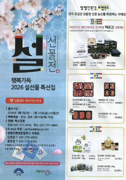 한편, 양평 농특산물 설 선물전 택배 주문은 관내·관외 모두 2월 10일까지 가능하다. 주문은 양평친환경로컬푸드협동조합 사무국으로 문의하거나, 양평친환경로컬푸드 누리집에서 주문서를 내려받아 팩스 또는 전자우편으로 신청하면 된다.