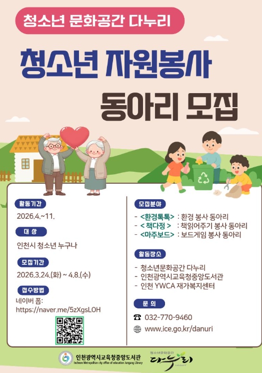 [파이낸셜경제=김기보 기자] 인천광역시교육청중앙도서관 청소년문화공간 ‘다누리’는 3월 24일부터 4월 8일까지 인천 관내 청소년을 대상으로 자원봉사 동아리 참여자를 모집한다.