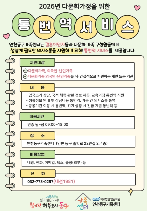 [파이낸셜경제=김기보 기자] 인천동구가족센터는 결혼이민자의 언어 장벽을 해소하고 안정적인 한국 사회 정착을 돕기 위해 ‘결혼이민자 통·번역 무료서비스’를 운영한다고 밝혔다.
