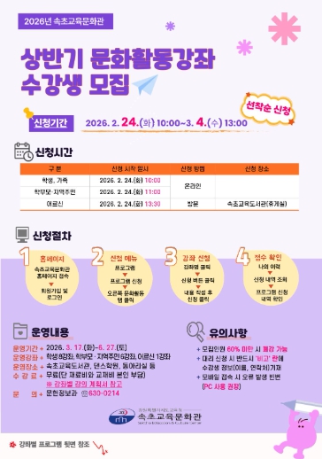 수강생 모집은 2월 24일 3월 4일 진행되며, 참가 신청은 속초교육문화관 누리집에서 받는다. 단, 어르신 강좌는 방문 접수로 진행한다.