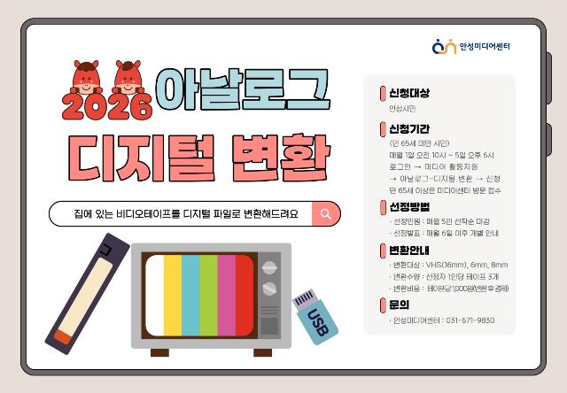 이번 사업은 VHS 테이프(16mm), 캠코더 테이프(6mm·8mm) 등 시민이 소장한 영상 기록물을 디지털 파일로 변환·제공해 TV, 컴퓨터, 스마트폰 등 다양한 디지털 기기로 가족·지인과 함께 공유할 수 있도록 지원하는 프로그램이다. 변환 대상은 결혼식, 가족여행, 돌잔치, 졸업식, 안성의 옛 모습 등 시민이 직접 촬영·기록한 비디오테이프라면 가능하다.