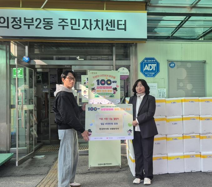 [파이낸셜경제=김기보 기자] 의정부시 의정부2동주민센터는 11월 12일 한국마사회 의정부지사가 ‘100일간 사랑릴레이 배턴 잇기’에 동참해 성금 450만 원을 기부했다고 밝혔다.