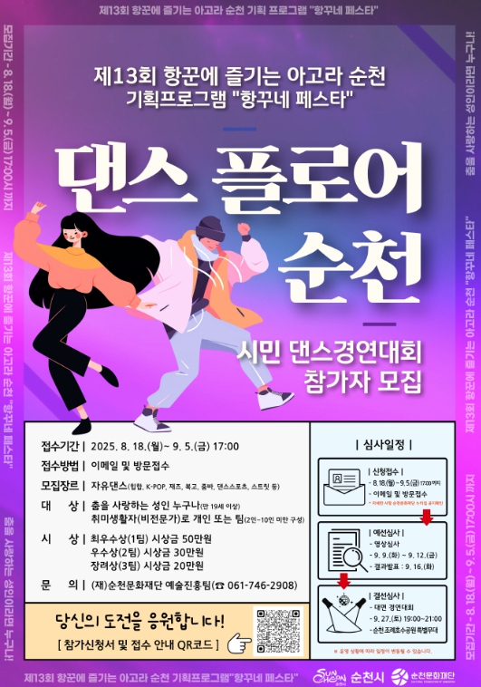 [파이낸셜경제=김예빈 기자] 순천문화재단은 제13회 항꾼에 즐기는 아고라 순천 사업 일환으로 진행되는 ‘항꾸네 페스타’시민 댄스경연대회 '댄스플로어 순천' 의 참가자를 오는 8월 18일부터 9월 5일까지 모집한다고 밝혔다.