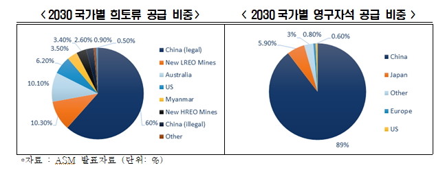 첫 번째 세션인 핵심광물 부문에서 호주 측 발표자료 나선 데이비드 우달(David Woodall) ASM* (Australian Strategic Materials) CEO는 “전기차, 풍력 터빈, 항공우주, 통신 등 신재생에너지, 차세대 산업에 핵심소재로 사용되는 영구자석(permanent magnets)이 현재 거의 독점적으로 중국, 단일 국가에 의해 공급되고 있고 미래에도 중국에 전적으로 의존할 것으로 전망된다.”고 경고하였다.