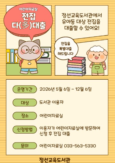 [파이낸셜경제=조성환 기자] 정선교육도서관은 5월 6일부터 12월 6일까지 어린이자료실에서 어린이자료실 이용 활성화와 지역 내 독서 문화 확산을 위해 ‘전집다(多)대출’을 운영한다.