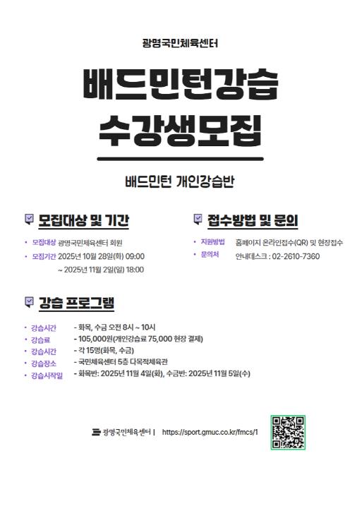 [파이낸셜경제=김기보 기자] 광명도시공사 광명국민체육센터가 시민들의 꾸준한 생활체육 수요와 배드민턴에 대한 높은 관심을 반영해 배드민턴 개인강습 프로그램을 신규 개설한다.