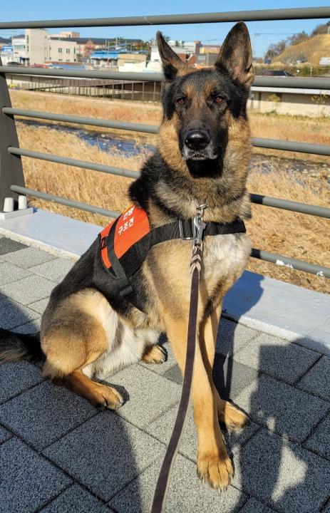 119구조견 ‘투리’(저먼 셰퍼드, 8세, 수컷)는 담당 핸들러 김승환 대원과 지난 2022년 12월부터 호흡을 맞춰 출동 임무를 수행해왔다.