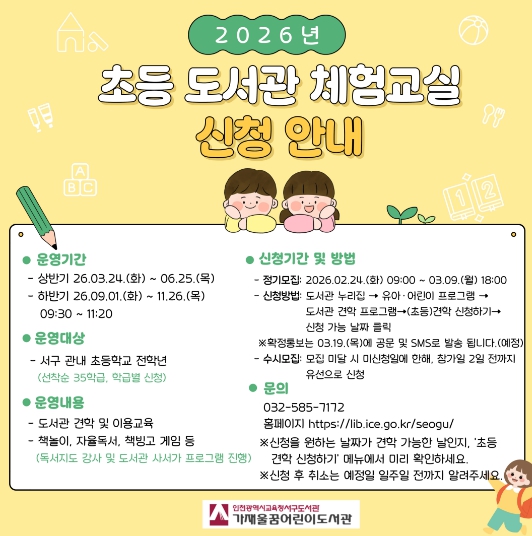 [파이낸셜경제=김기보 기자] 인천광역시교육청서구도서관은 25일부터 도서관 현장 체험 프로그램 ‘도서관 체험교실’에 참여할 초등학교를 모집한다.